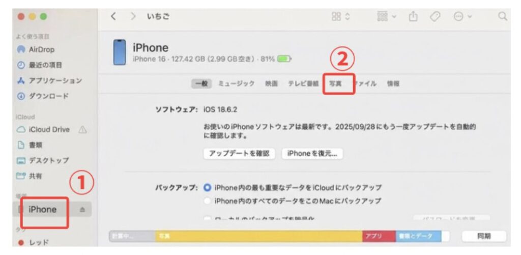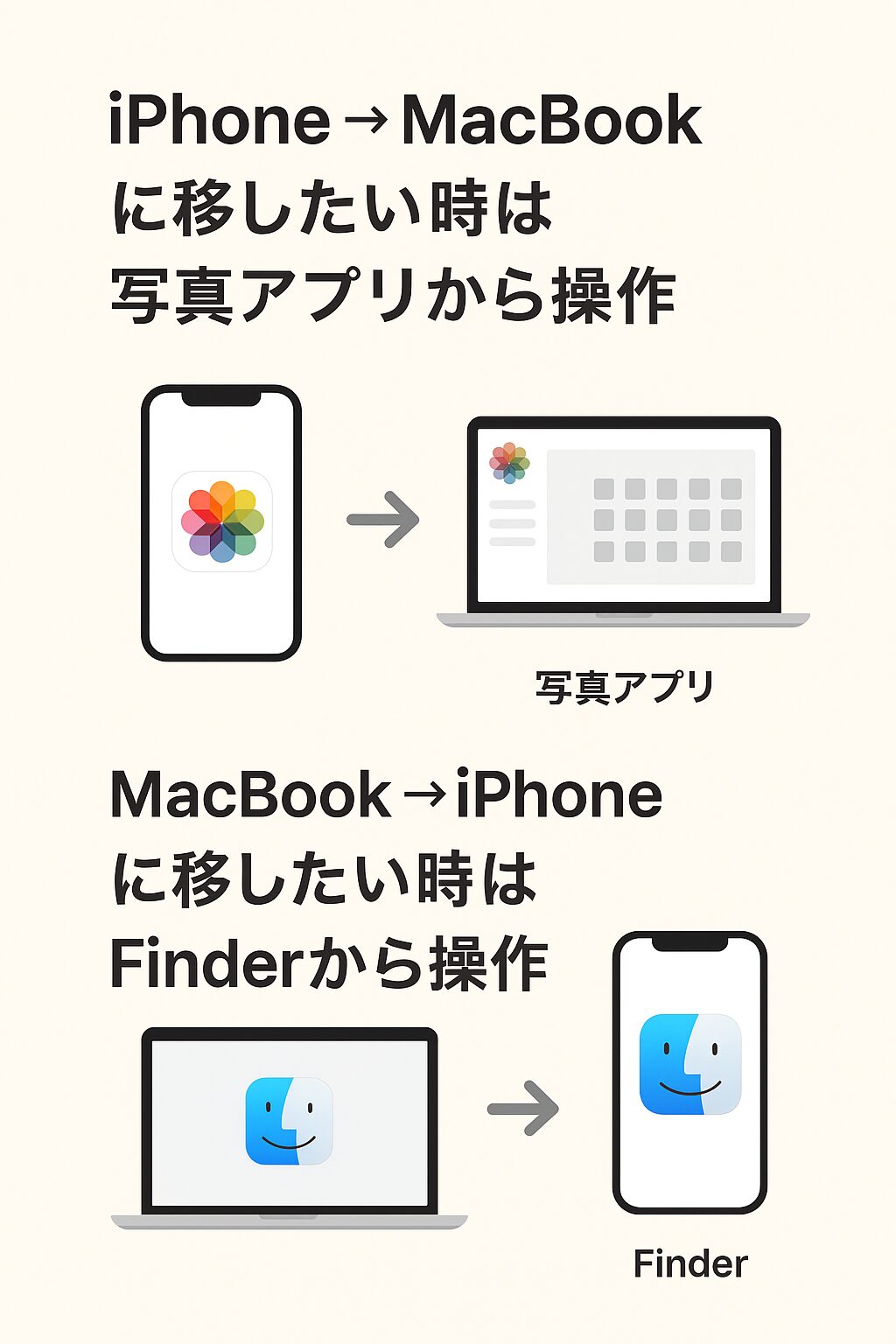 - 移動の方向で操作アプリが違う - iPhone → MacBook は「写真アプリ」 - MacBook → iPhone は「Finder」